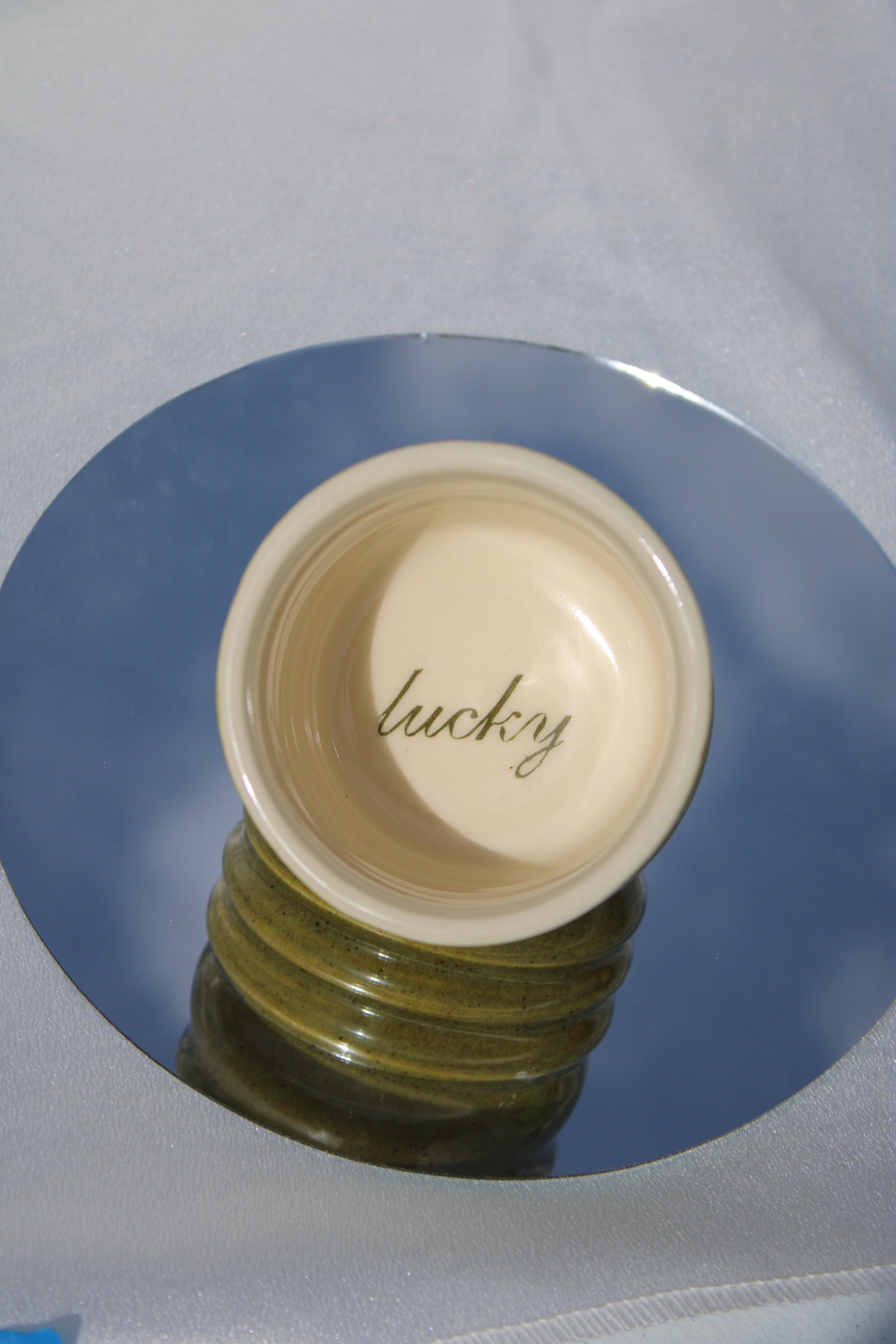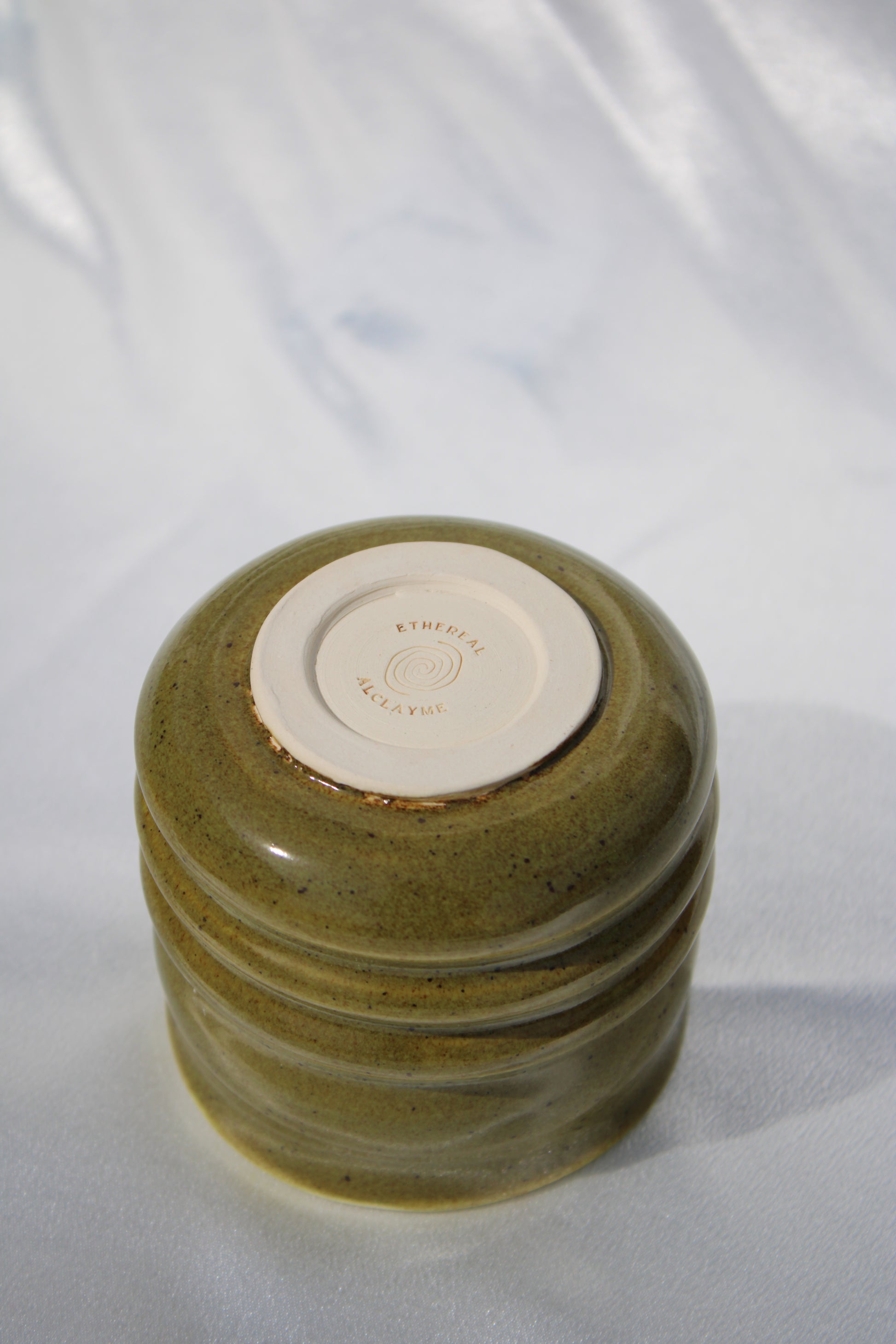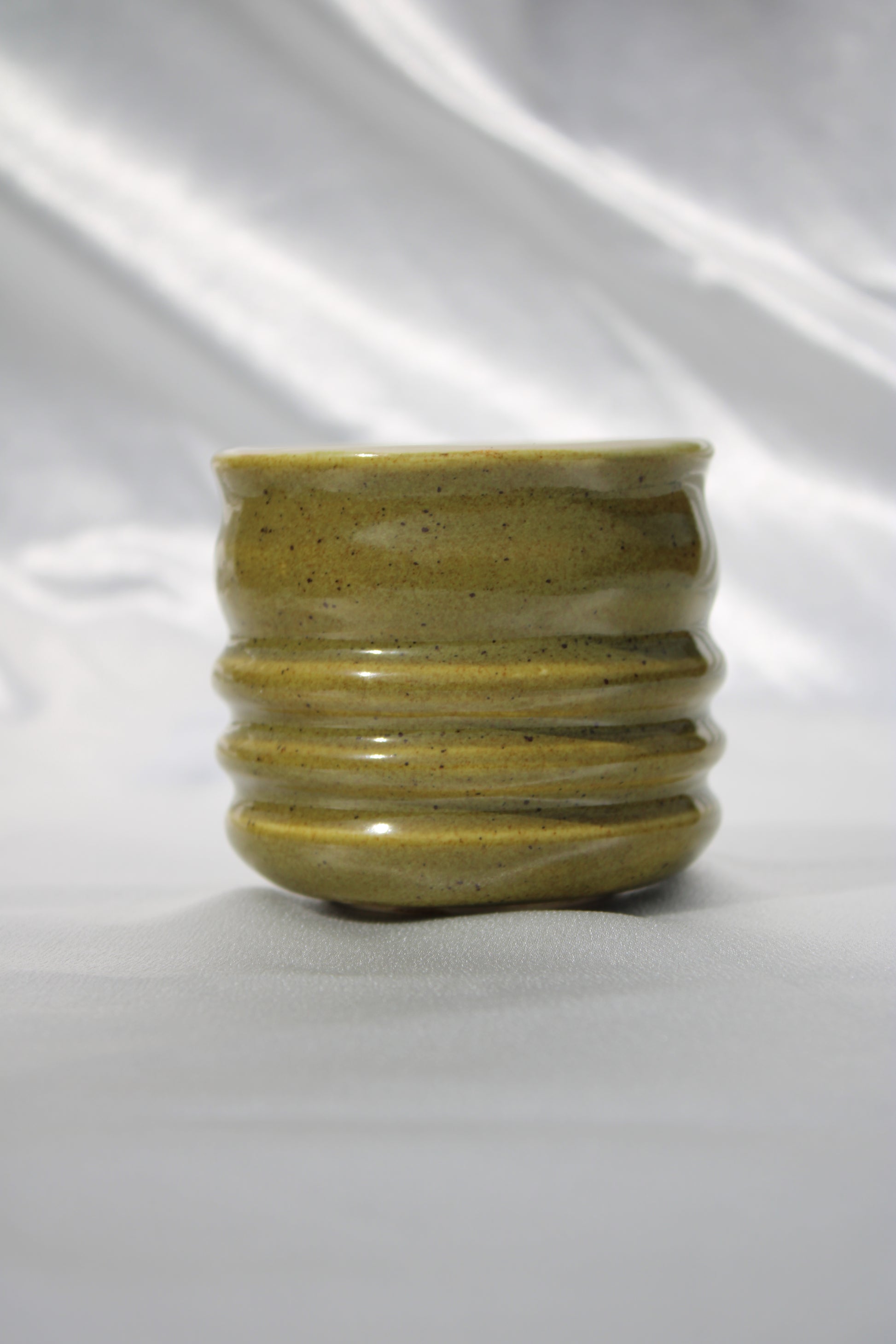 This one-of-a-kind ceramic cup features an olive speckle glaze with a wavy texture and a hidden “lucky” under-glaze at its base, revealed only after you finish your drink.