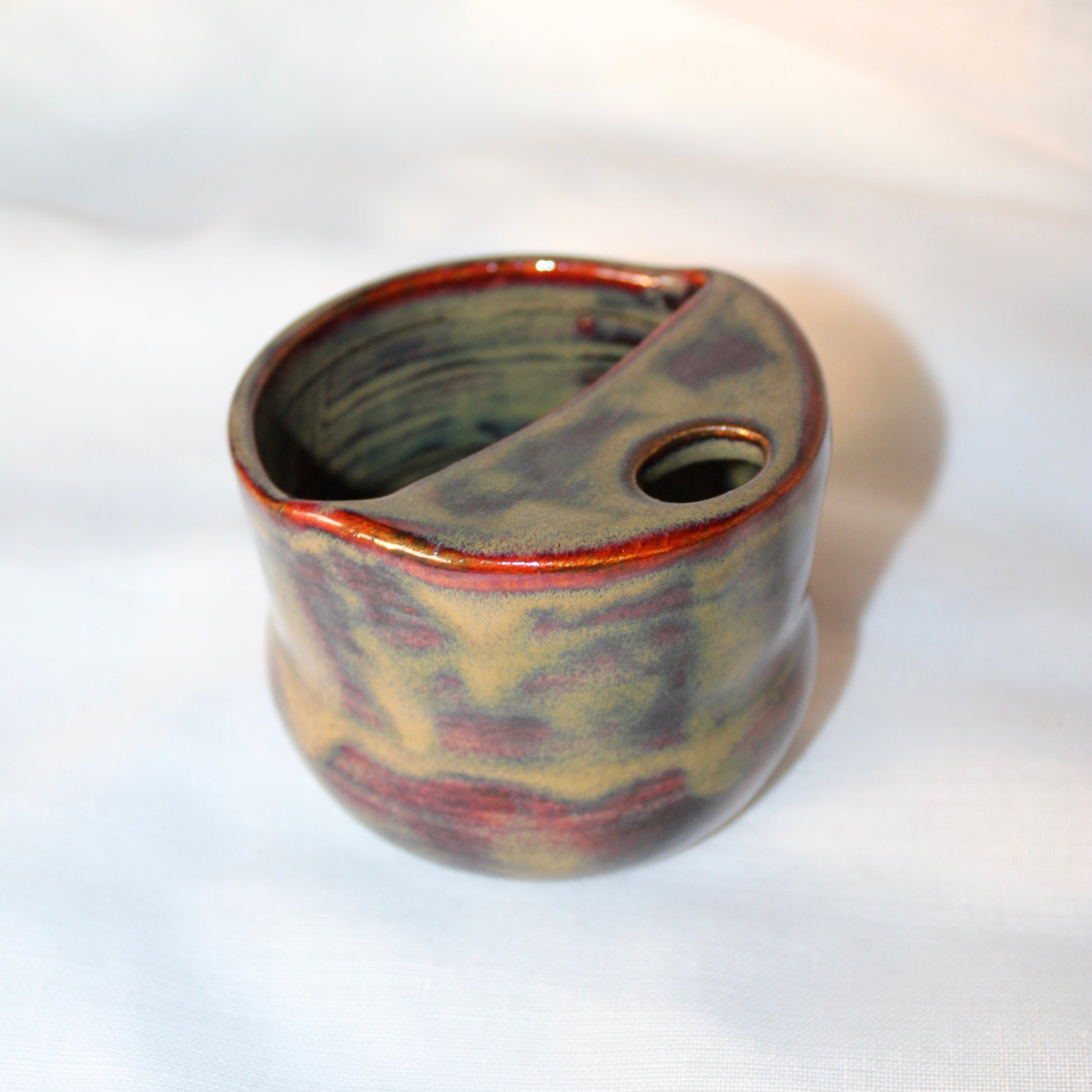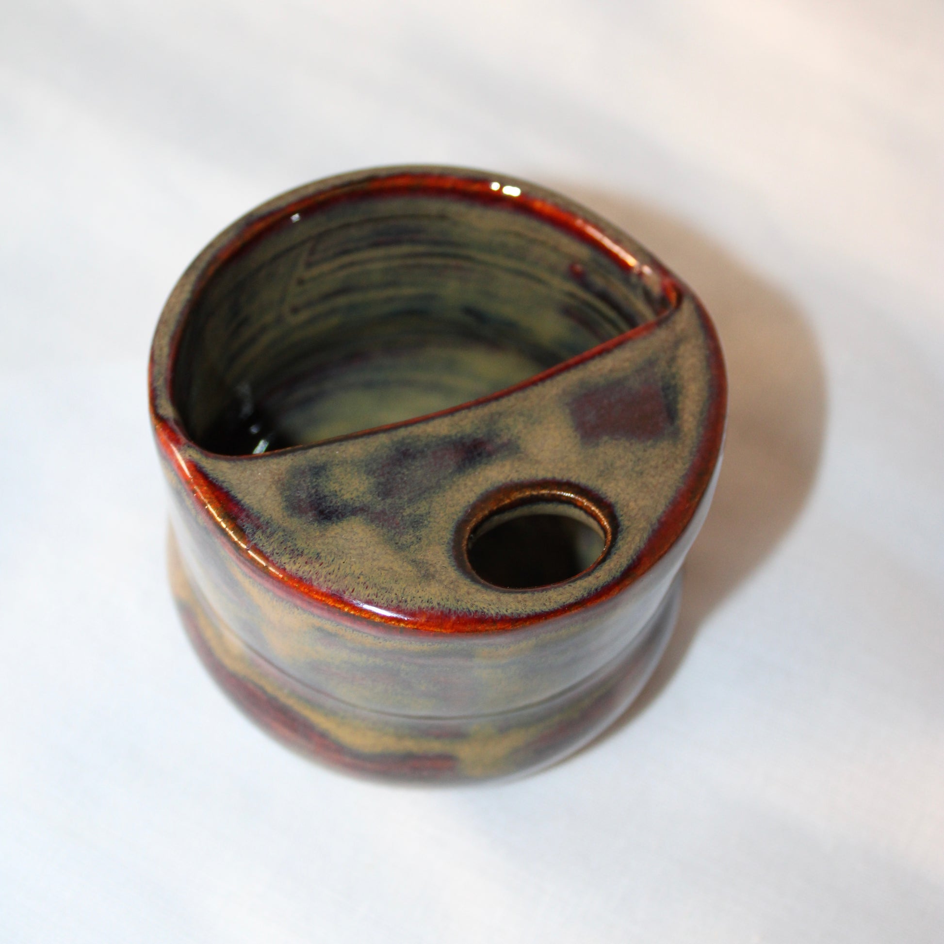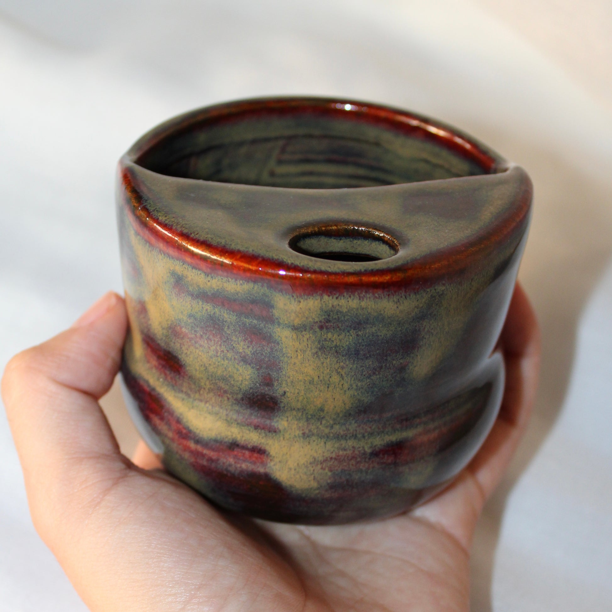 Rounded at the base, leaning into an angled edge. The surface gleams with deep red, amber, and violet — alive, warm, and on the edge of movement.