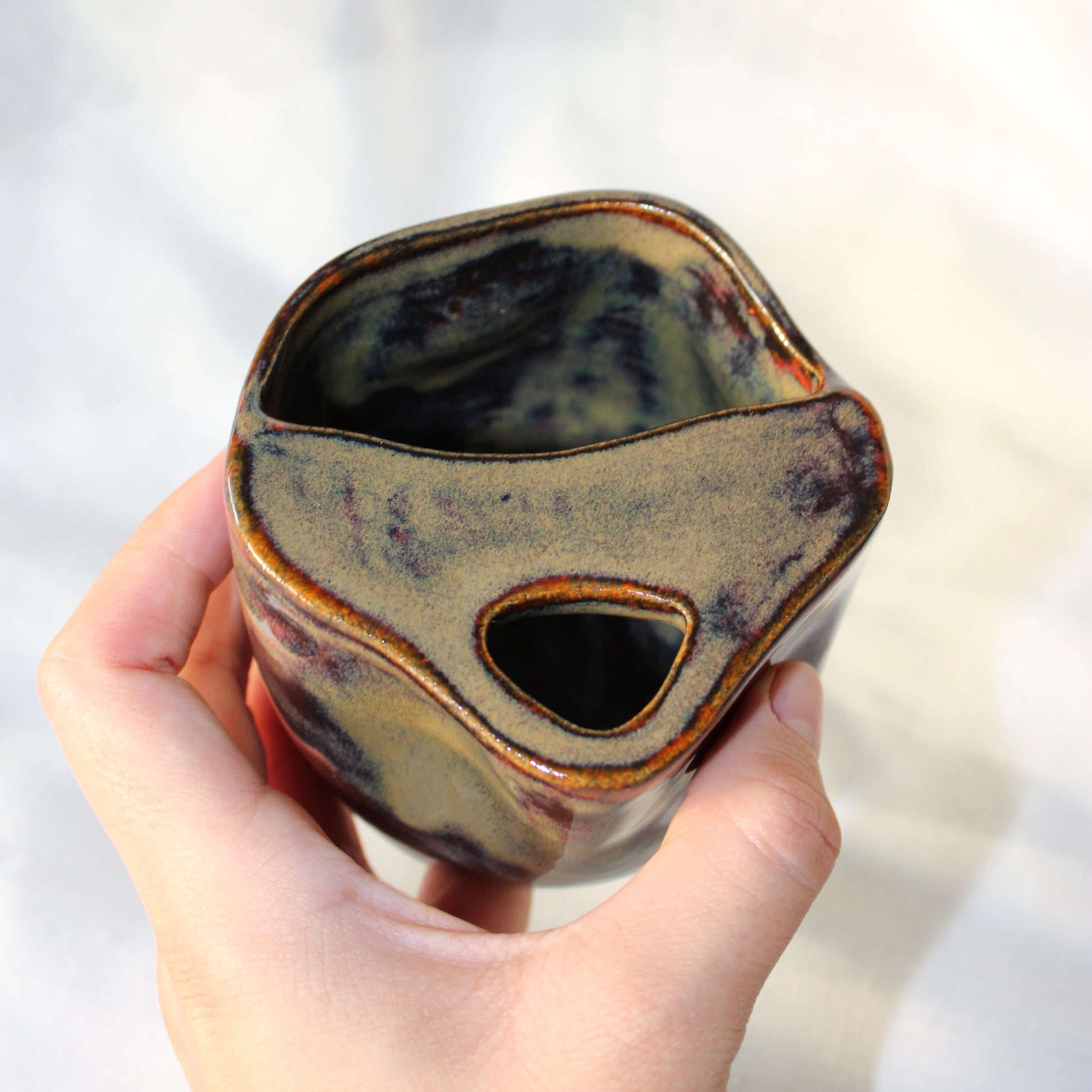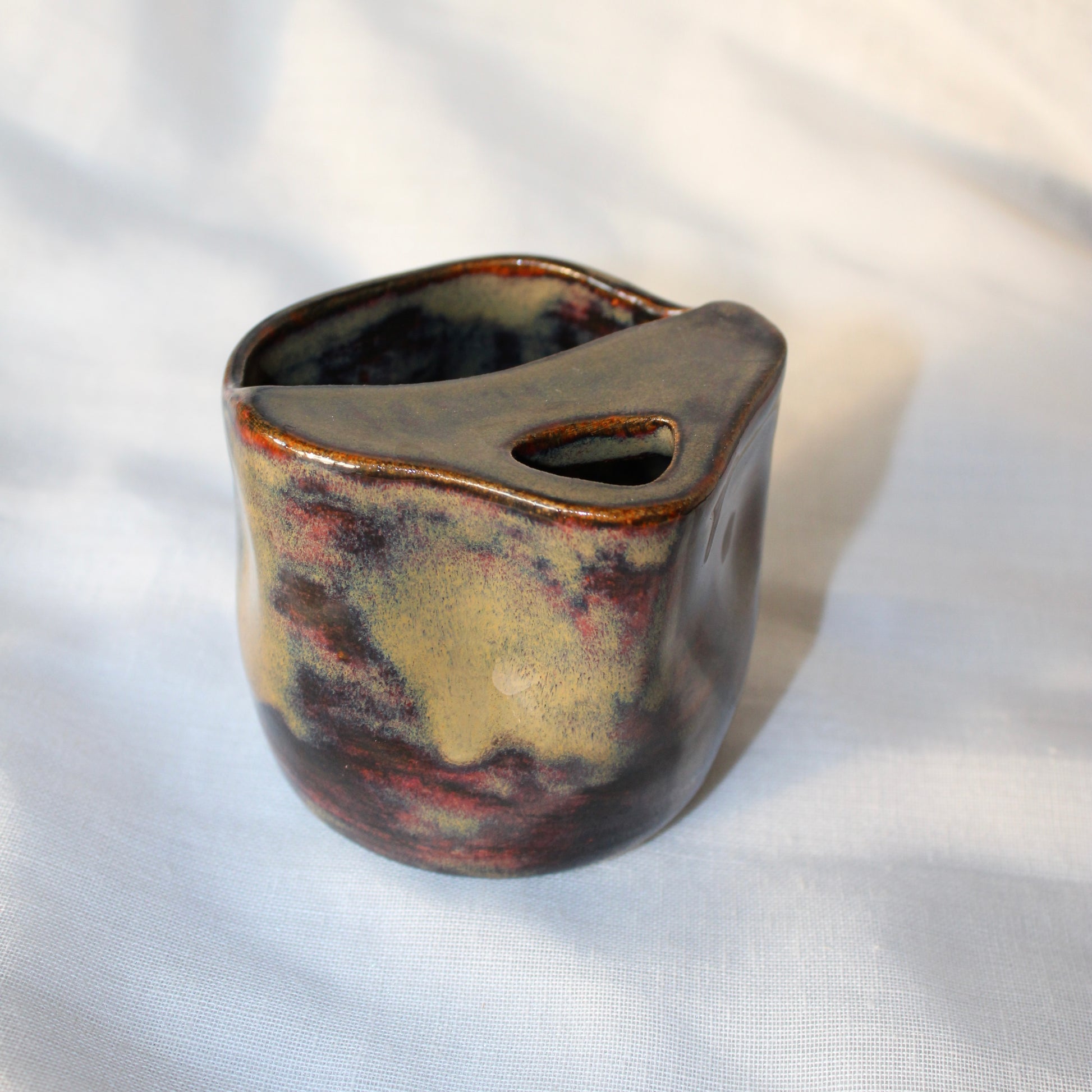 Organic and imperfect, this cup curves gently in the hand. Its warm reddish-brown, violet and amber tones melt across the surface, reflecting the gentle flow and imperfection of nature itself.